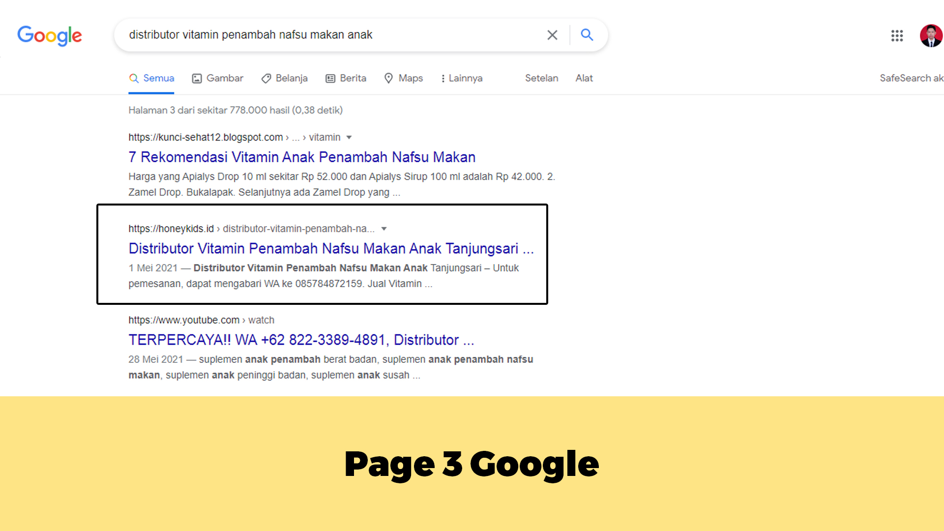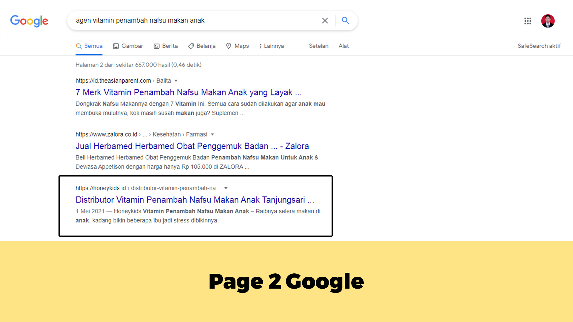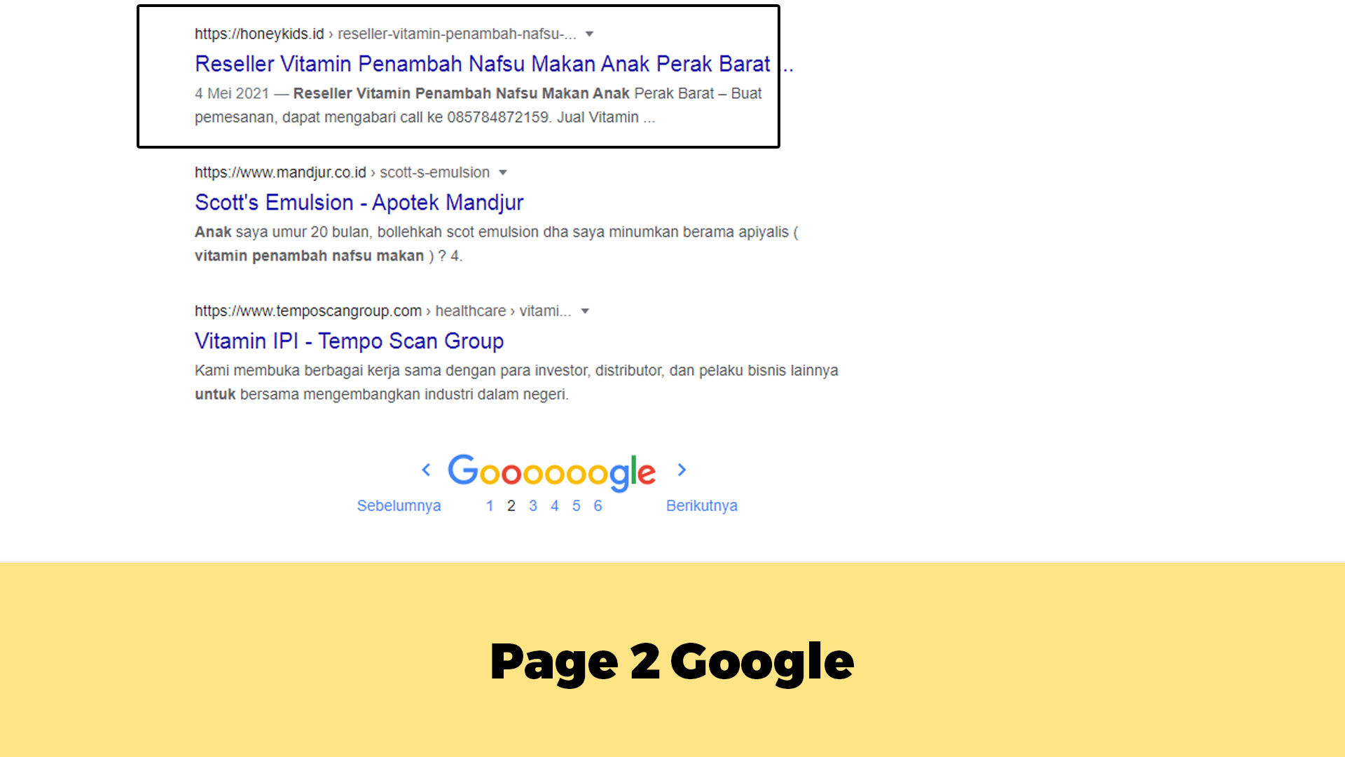 Optimasi SEO pada website honeykids di fokuskan pada kata kunci long tail keyword, dimana diawali dengan buying keyword dan diikuti kata kunci utamanya adalah vitamin penambah nafsu makan anak. Setelah di optimasi selama 3 bulan, website Honeykids berada pada urutan halaman 2 dan 3 pada pencarian google